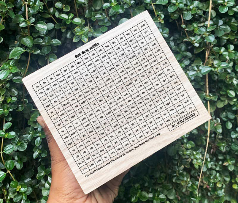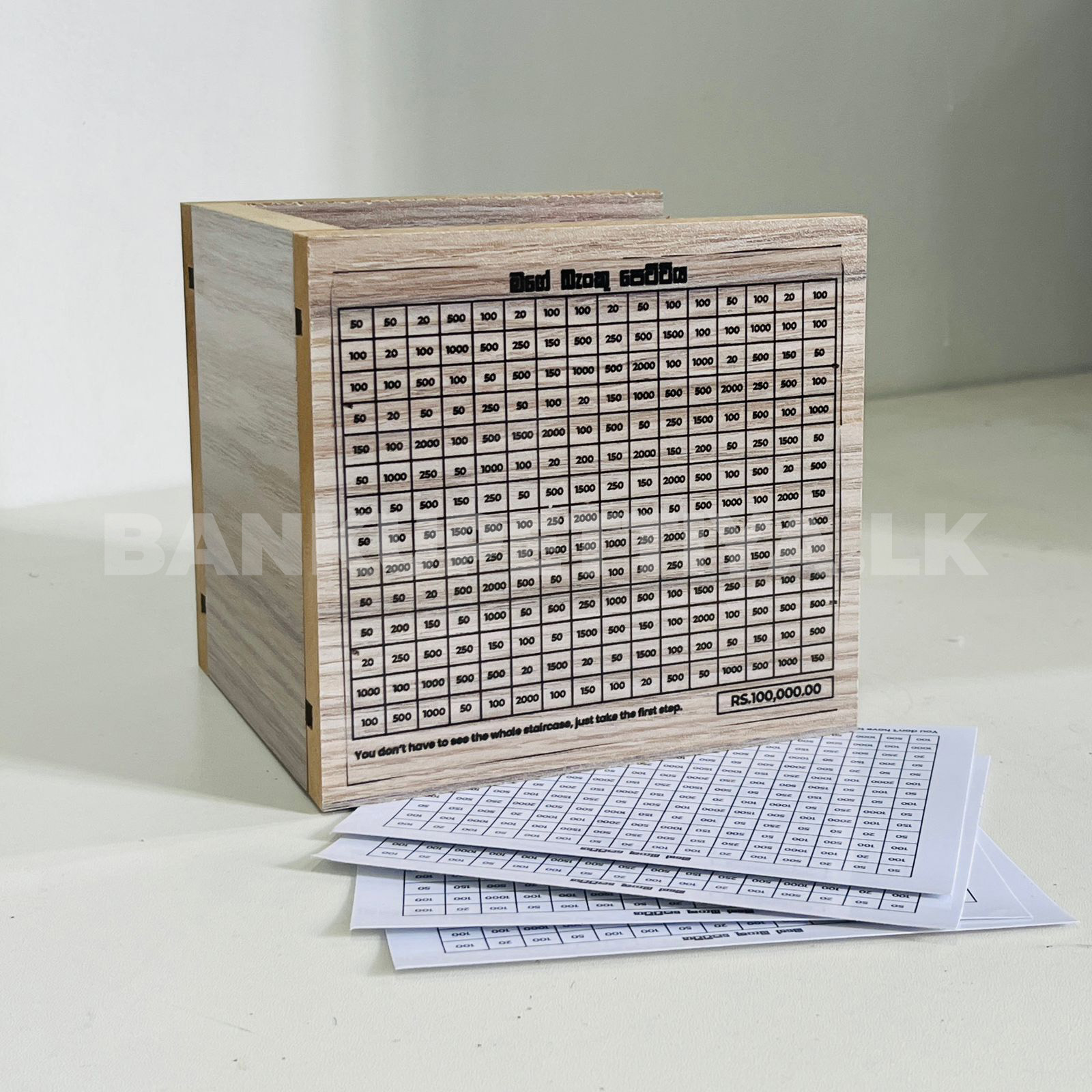 01. ඔබගේ බැංකු පෙට්ටියෙහි අලවා ඇති වගුවේ තිබෙන ආකාරයට ඔබට හැකි සෑම විටකම එහි තිබෙන මුදල් ප්රමාණය බැංකු පෙට්ටියට දමා අප විසින් ඒවා ඇති පෑනෙන් අදාල කොටුව කපාහරින්න.